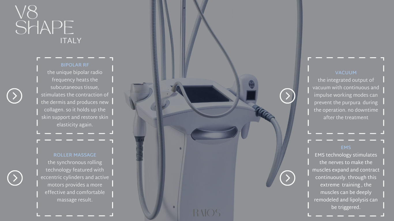 V8 shape technology works with a combination of infrared light, bi-polar radio frequency energy and vacuum, which cause deep heating of the fat cells, their surrounding connective tissue and the underlying dermal collagen fibers. This type of efficient heating, causing deep stimulates the growth of new and better collagen and elastin which results in a localized reduction in skin laxity, body volume, and an overall improvement in skin structure and texture.